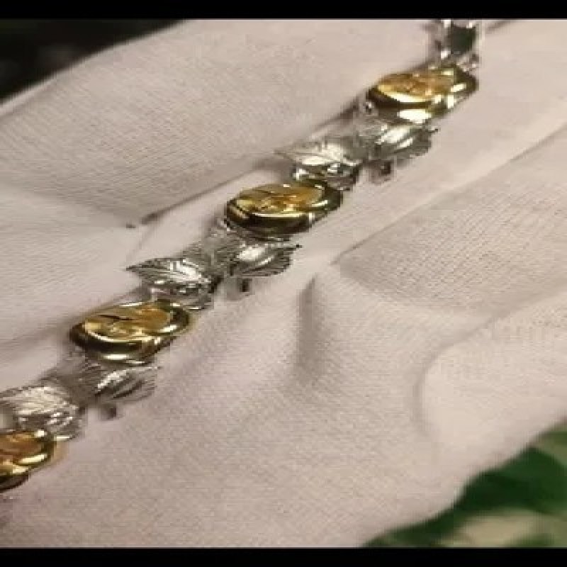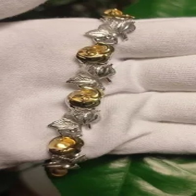 Женский золотой браслет Цветы Розы жёлтого-белого цвета матово-глянцевый с Бриллиантами из коллекции "Роза". Российская "Ювелирная фабрика "Альдзена» создаёт украшения, которые подарят прекрасное настроение и помогут продлить ощущение наступления весенней свежести, почувствовать тепло жаркого лета, вкус сочных ягод и фруктов, погрузиться в яркие краски теплой золотой осени в окружении роскошных цветов,осенних кленовых листьев, сочных ягод и фруктов, насекомых,обитателей подводного царства. грациозных животных,ангелов,воздушных романтичных шариков,объёмных романтичных сердец, стройных девушек акробатов, резвых и свободных мустангов. Завораживающая кратковременная красота хрупкого цветка пленяет душу, грациозные животные подчёркивают красоту и грациозность любой женщины,девушки, маленькие нежные насекомые придают лёгкость. Великолепные цветы из золота, сочные фрукты , впитавшие в себя солнечные краски лета, ослепительно красивы и аппетитны. От них веет чем-то не земным, волшебным. Потрясающая цветочная коллекция сочетает в себе целую гамму чувств и эмоций. Это заповедник полный чудес, многие из которых предстоит раскрыть счастливой обладательнице любого маленького шедевра "Ювелирного производства"Альдзена". Многие модели сделаны членами Союза Художников. Украшения производятся на оборудовании, сделанном по последнему слову техники. Каждое изделие прорабатывается вручную с использование различных техник проработки : фактурирование, матовка,родирование,мелкая пластика и т.д. Многие из изделий Ювелирного производства Альдзена удостоены различных наград за оригинальность исполнения художественной идеи,изысканность украшений, уникальность и т.д . Металл:Золото Au 585 Средний вес: 26,90 гр Цвет металла: Жёлтый/Белый Вставки: 6 Бр Кр 57А 2.0 3/5 (30-40) 0.188ctТочный вес изделия и характеристики камней будут указаны на заводской бирке, которая является паспортом изделия.